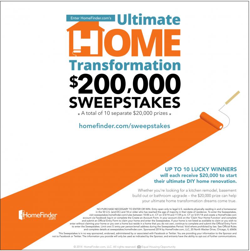 NO PURCHASE NECESSARY TOENTER OR WIN. Entry open only to legal U.S. residents physically residing in and ahomeowner in the 50 U.S. (and DC) and 18 or older who has reached the age of majority in their state of residence. To enter the Sweepstakes, visit sweepstakes.homefinder.com/rules between 10:00 a.m. CT on 3/3/14 and 11:59 p.m. CT on 5/31/14 and create aHomeFinder.com account via Facebook log-in or complete the Create an Account Form. In your account click on the ‘Claim Your Home Function’ and complete and submit an Official Entry Form to claim your home and enter the Sweepstakes. If your home is not listed as available to claim or you wish to enter without claiming your home or you own ahome but reside in ahome that you do not own, continue to complete and submit the Official Entry Form to enter the Sweepstakes. Limit one (1) entry per person/email address during the Sweepstakes Period. Void where prohibited by law. See Official Rules and complete details at sweepstakes.homefinder.com. Sponsored 2014 by HomeFinder.com, LLC, 20 North Wacker Drive, Chicago, IL 60606