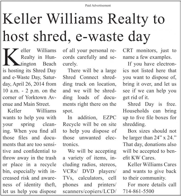 Williams Realty in Huntington Beach is hosting its Shred Day and e-Waste Day, Saturday,April 26, 2014 from 10 a.m. - 2 p.m. on the corner of Yorktown Avenue and Main Street.