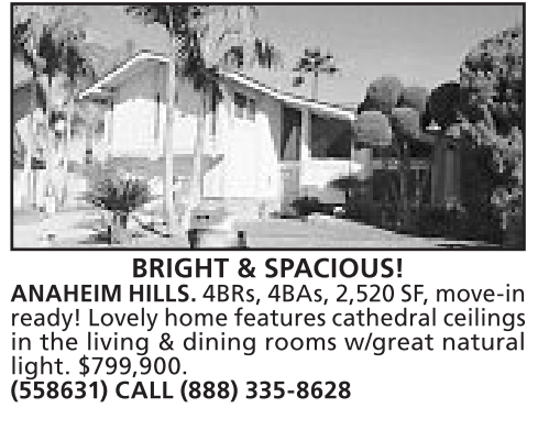 ANAHEIM HILLS. 4BRs,4BAs, 2,520SF, move-in ready!Lovelyhomefeaturescathedral ceilings in the living & dining rooms w/great natural light. $799,900. (558631) CALL (888) 335-8628