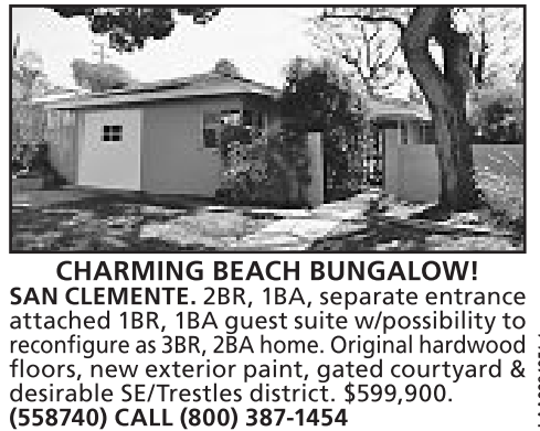 SAN CLEMENTE. 2BR, 1BA, separate entrance attached 1BR, 1BAguest suitew/possibility to reconfigureas3BR,2BA home.Original hardwood floors, new exterior paint, gated courtyard & desirable SE/Trestles district. $599,900. (558740) CALL (800) 387-1454