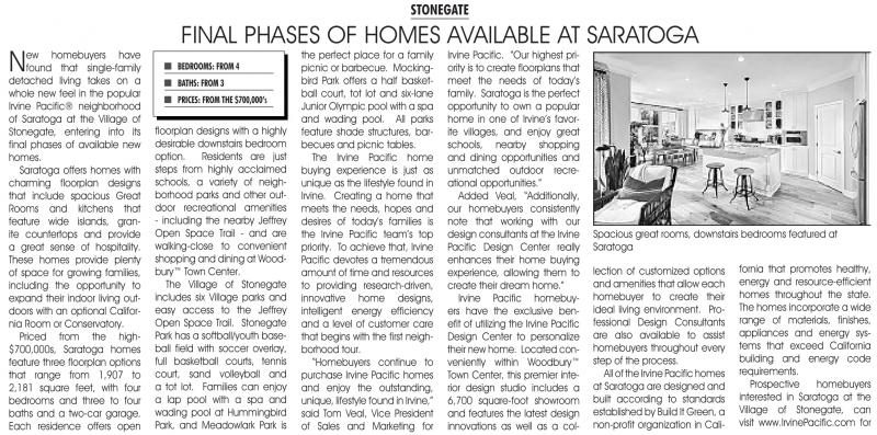 homebuyers have found that single-family detached living takes on awhole new feel in the popular Irvine Pacific® neighborhood of Saratoga at the Village of Stonegate, entering into its final phases of available new homes.