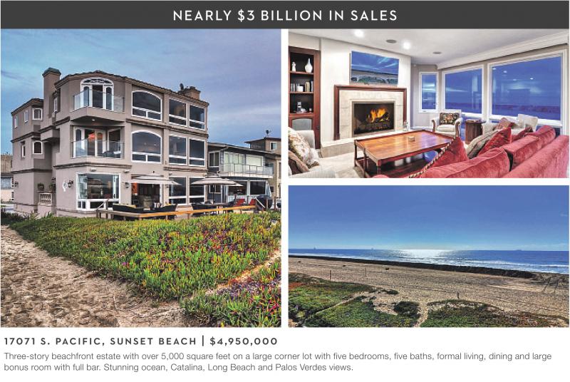 N E A R LY $ 3 B I L L I O N I N SA L E S 17071 S. PACIFIC, SUNSET BEACH | $4,950,000 Three-story beachfront estate with over 5,000 square feet on a large corner lot with five bedrooms, five baths, formal living, dining and large bonus room with full bar. Stunning ocean, Catalina, Long Beach and Palos Verdes views.