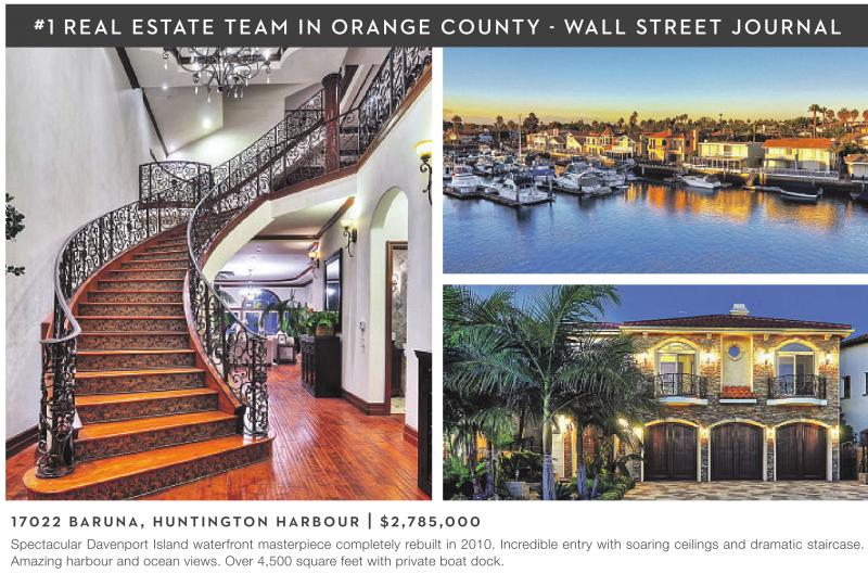 # 1 R E A L E STAT E T E A M I N O RA N G E CO U N T Y - WA L L ST R E E T J O U R N A L 17022 BARUNA, HUNTINGTON HARBOUR | $2,785,000 Spectacular Davenport Island waterfront masterpiece completely rebuilt in 2010. Incredible entry with soaring ceilings and dramatic staircase. Amazing harbour and ocean views. Over 4,500 square feet with private boat dock.