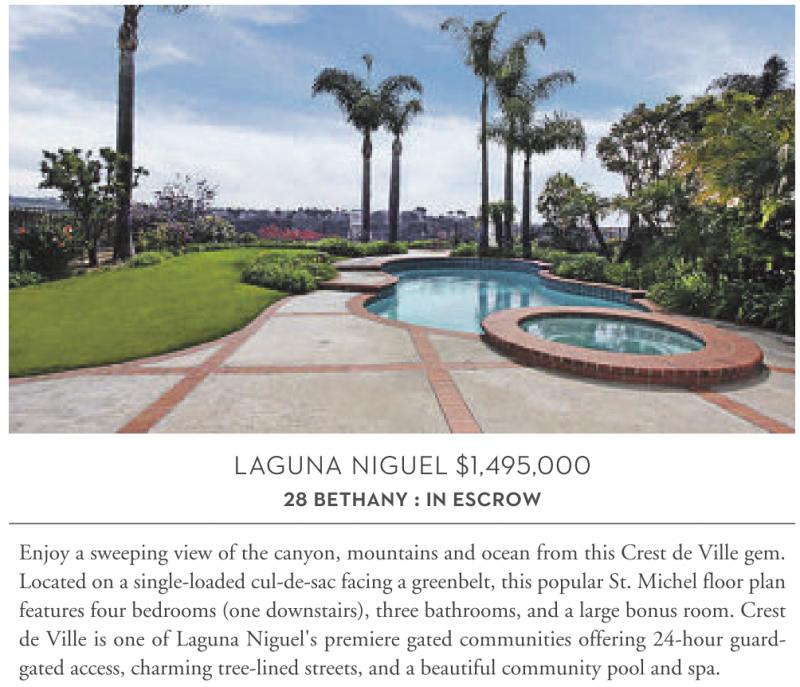 LAGUNA NIGUEL $1,495,000 28 BETHANY : IN ESCROW Enjoy a sweeping view of the canyon, mountains and ocean from this Crest de Ville gem. Located on a single-loaded cul-de-sac facing a greenbelt, this popular St. Michel floor plan features four bedrooms (one downstairs), three bathrooms, and a large bonus room. Crest de Ville is one of Laguna Niguel's premiere gated communities offering 24-hour guardgated access, charming tree-lined streets, and a beautiful community pool and spa.