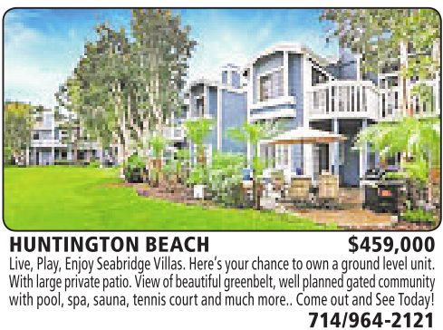 HUNTINGTON BEACH $459,000 Live, Play,Enjoy Seabridge Villas. Here’s your chancetoown aground level unit. With large privatepatio.Viewofbeautifulgreenbelt, well plannedgated community with pool, spa, sauna, tennis courtand muchmore.. Come outand See Today!