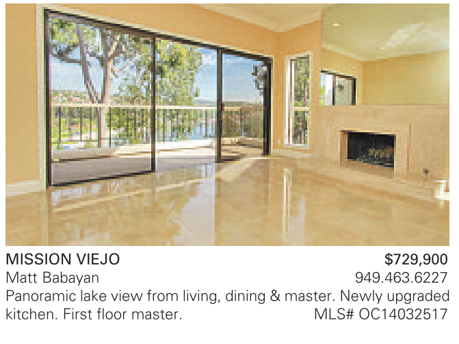 MISSION VIEJO $729,900 Matt Babayan 949.463.6227 Panoramic lake view from living, dining &master. Newly upgraded kitchen. First floor master. MLS# OC14032517