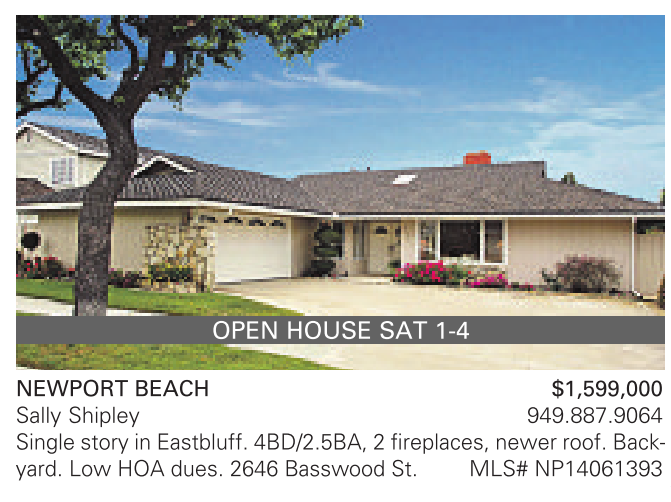 NEWPORT BEACH $1,599,000 Sally Shipley 949.887.9064 Single story in Eastbluff. 4BD/2.5BA, 2fireplaces, newer roof. Backyard. Low HOA dues. 2646 Basswood St. MLS# NP14061393