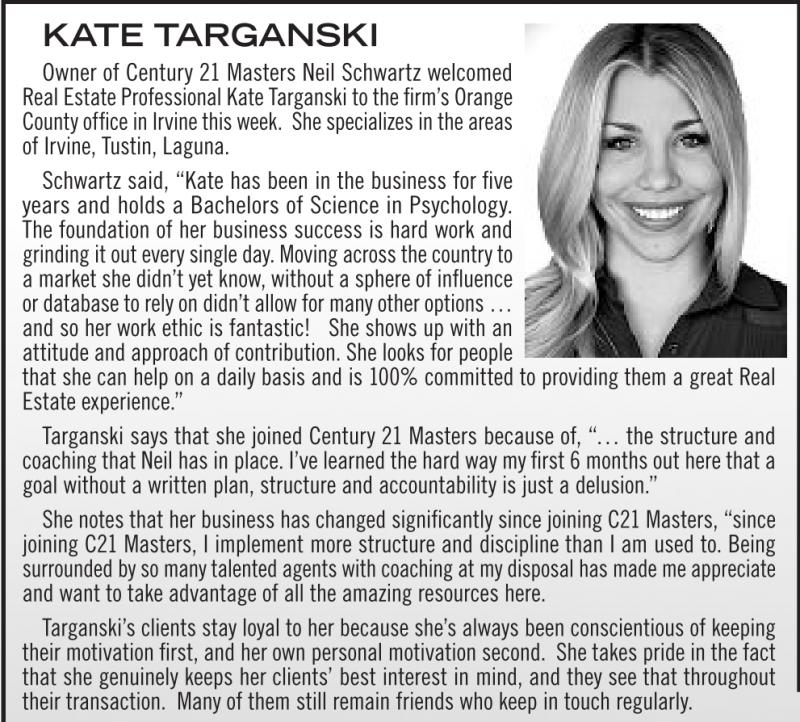 Owner of Century 21 Masters Neil Schwartz welcomed Real Estate Professional Kate Targanski to the firm’s Orange County office in Irvine this week. She specializes in the areas of Irvine, Tustin, Laguna.