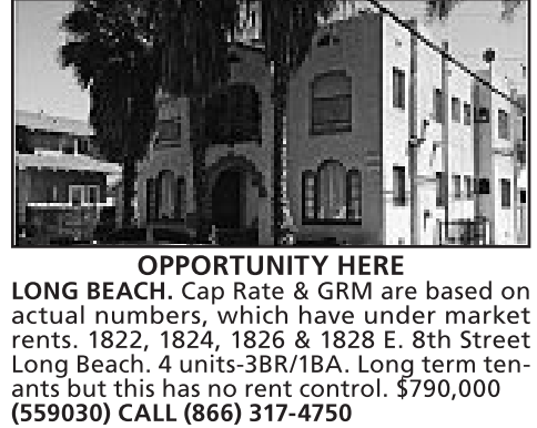 Long Beach. 4 units-3BR/1BA. Long term tenants but this has no rent control. $790,000 (559030) CALL (866) 317-4750