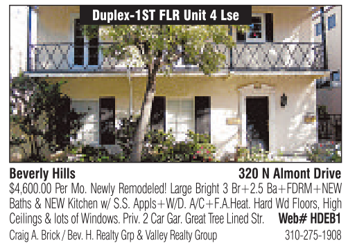 Beverly Hills Duplex-1ST FLR Unit 4Lse 320 NAlmont Drive Craig A. Brick /Bev.H.Realty Grp &Valley Realty Group 310-275-1908 $4,600.00 PerMo. Newly Remodeled! Large Bright 3Br+2.5 Ba+FDRM+NEW Baths &NEW Kitchen w/ S.S. Appls+W/D. A/C+F.A.Heat. HardWdFloors, High Ceilings &lots of Windows. Priv.2Car Gar.Great Tree Lined Str. Web# HDEB1