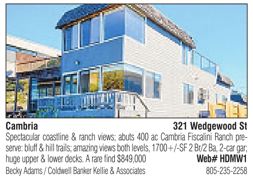 Spectacular coastline &ranch views; abuts 400 ac Cambria Fiscalini Ranch preserve: bluff &hill trails; amazing views both levels, 1700+/-SF 2Br/2 Ba, 2-car gar; huge upper &lower decks. Ararefind $849,000 Web# HDMW1