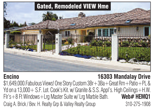 Encino Gated, Remodeled VIEW Hme 16303 Mandalay Drive Craig A. Brick /Bev.H.Realty Grp &Valley Realty Group 310-275-1908 $1,649,000.Fabulous Views! One Story Custom 3Br+3Ba+Great Rm+Patio+PL & Yd on a13,000+ S.F. Lot. Cook’s Kit. w/ Granite &S.S. Appl’s. High Ceilings+H.W. Flr’s+8 Ft Windows+LrgMaster Suite w/ LrgMarble Bath. Web# HEMQ1 See also