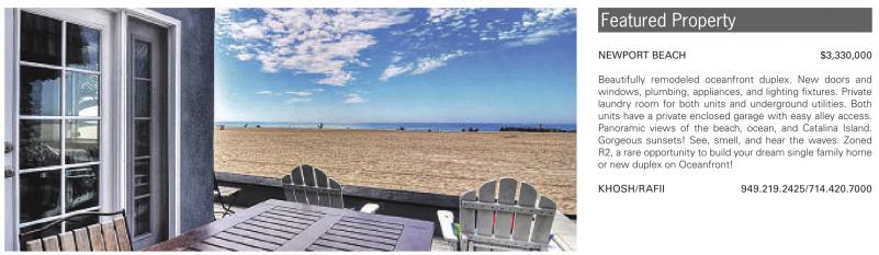 Featured Property NEWPORT BEACH $3,330,000 Beautifully remodeled oceanfront duplex. New doors and windows, plumbing, appliances, and lighting fixtures. Private laundry room for both units and underground utilities. Both units have a private enclosed garage with easy alley access. Panoramic views of the beach, ocean, and Catalina Island. Gorgeous sunsets! See, smell, and hear the waves. Zoned R2, a rare opportunity to build your dream single family home or new duplex on Oceanfront! KHOSH/RAFII 949.219.2425/714.420.7000