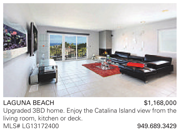 LAGUNA BEACH $1,168,000 Upgraded 3BD home. Enjoythe Catalina Island viewfrom the living room, kitchen or deck. MLS# LG13172400 949.689.3429