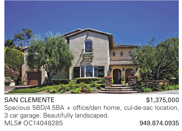 SAN CLEMENTE $1,375,000 Spacious 5BD/4.5BA + office/den home, cul-de-sac location, 3 car garage. Beautifully landscaped. MLS# OC14048285 949.874.0935