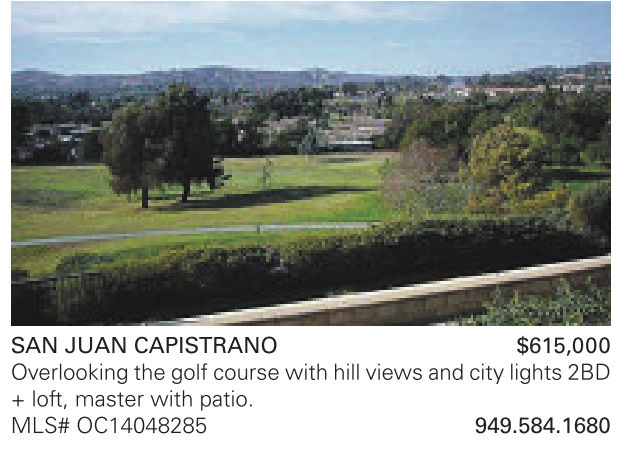 SAN JUAN CAPISTRANO $615,000 Overlooking the golf course with hill views and citylights 2BD + loft, master with patio. MLS# OC14048285 949.584.1680
