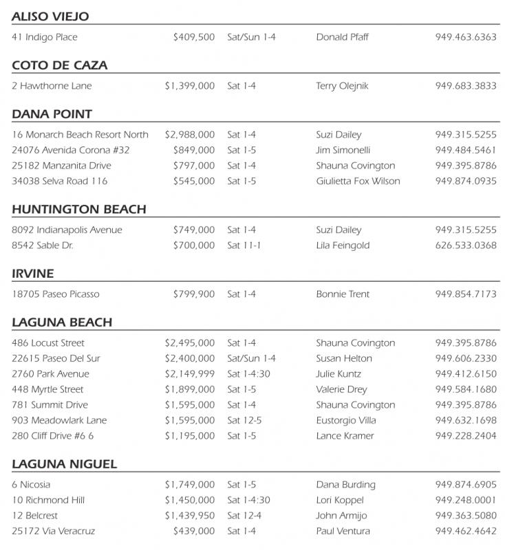 486 Locust Street $2,495,000 Sat 1-4 Shauna Covington 949.395.8786 22615 Paseo Del Sur $2,400,000 Sat/Sun 1-4 Susan Helton 949.606.2330 2760 Park Avenue $2,149,999 Sat 1-4:30 Julie Kuntz 949.412.6150 448 Myrtle Street $1,899,000 Sat 1-5 Valerie Drey 949.584.1680 781 Summit Drive $1,595,000 Sat 1-4 Shauna Covington 949.395.8786 903 Meadowlark Lane $1,595,000 Sat 12-5 Eustorgio Villa 949.632.1698 280 Cliff Drive #6 6 $1,195,000 Sat 1-5 Lance Kramer 949.228.2404