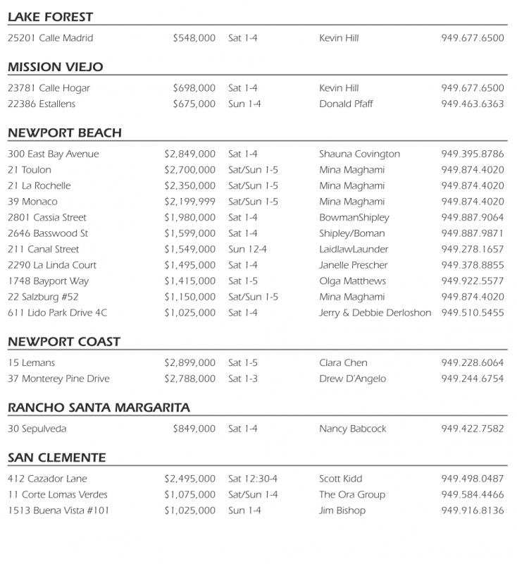 300 East Bay Avenue $2,849,000 Sat 1-4 Shauna Covington 949.395.8786 21 Toulon $2,700,000 Sat/Sun 1-5 Mina Maghami 949.874.4020 21 La Rochelle $2,350,000 Sat/Sun 1-5 Mina Maghami 949.874.4020 39 Monaco $2,199,999 Sat/Sun 1-5 Mina Maghami 949.874.4020 2801 Cassia Street $1,980,000 Sat 1-4 BowmanShipley 949.887.9064 2646 Basswood St $1,599,000 Sat 1-4 Shipley/Boman 949.887.9871 211 Canal Street $1,549,000 Sun 12-4 LaidlawLaunder 949.278.1657 2290 La Linda Court $1,495,000 Sat 1-4 Janelle Prescher 949.378.8855 1748 Bayport Way $1,415,000 Sat 1-5 Olga Matthews 949.922.5577 22 Salzburg #52 $1,150,000 Sat/Sun 1-5 Mina Maghami 949.874.4020 611 Lido Park Drive 4C $1,025,000 Sat 1-4 Jerry &Debbie Derloshon 949.510.5455