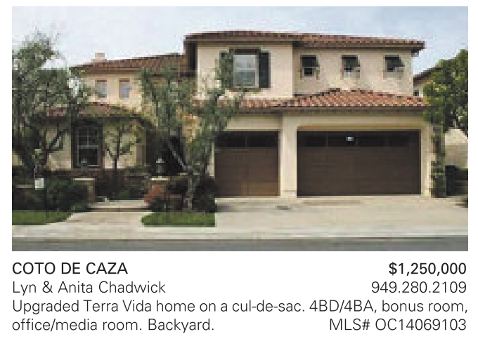 COTO DE CAZA $1,250,000 Lyn & Anita Chadwick 949.280.2109 Upgraded Terra Vida home on acul-de-sac. 4BD/4BA, bonus room, office/media room. Backyard. MLS# OC14069103
