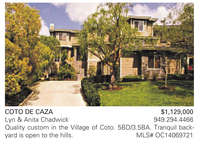 COTO DE CAZA $1,129,000 Lyn & Anita Chadwick 949.294.4466 Quality custom in the Village of Coto. 5BD/3.5BA. Tranquil backyard is open to the hills. MLS# OC14069721