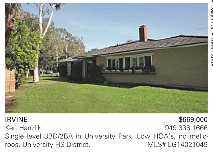 IRVINE $669,000 Ken Hanzlik 949.338.1666 Single level 3BD/2BA in University Park. Low HOA’s, no melloroos. University HS District. MLS# LG14021049