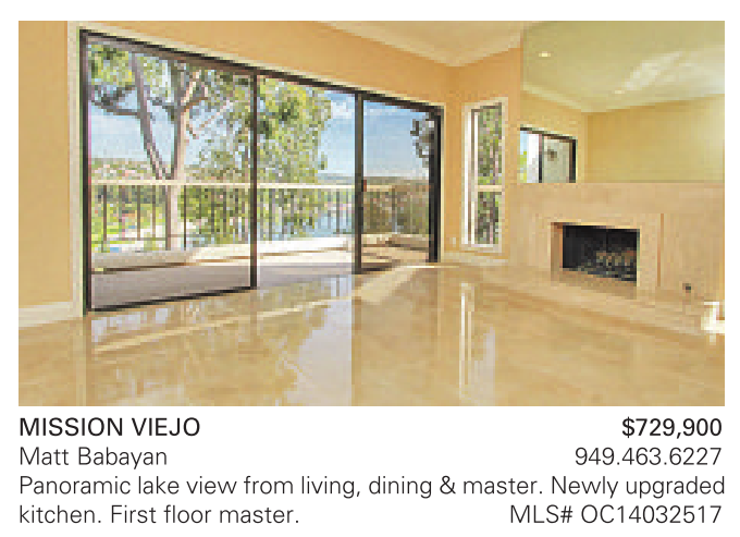 MISSION VIEJO $729,900 Matt Babayan 949.463.6227 Panoramic lake view from living, dining &master. Newly upgraded kitchen. First floor master. MLS# OC14032517