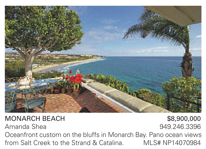 MONARCH BEACH $8,900,000 Amanda Shea 949.246.3396 Oceanfront custom on the bluffs in MonarchBay.Pano ocean views from Salt Creek to the Strand & Catalina. MLS# NP14070984