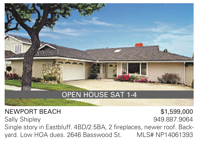 NEWPORT BEACH $1,599,000 Sally Shipley 949.887.9064 Single story in Eastbluff. 4BD/2.5BA, 2fireplaces, newer roof. Backyard. Low HOA dues. 2646 Basswood St. MLS# NP14061393