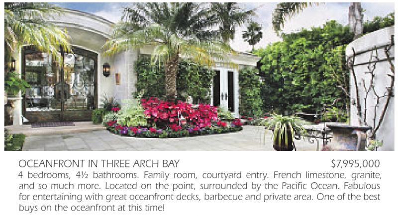 OCEANFRONT IN THREE ARCH BAY $7,995,000 4 bedrooms, 4½ bathrooms. Family room, courtyard entry. French limestone, granite, and so much more. Located on the point, surrounded by the Pacific Ocean. Fabulous for entertaining with great oceanfront decks, barbecue and private area. One of the best buys on the oceanfront at this time!