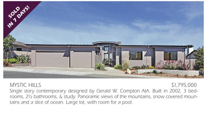 MYSTIC HILLS $1,795,000 Single story contemporary designed by Gerald W. Compton AIA. Built in 2002, 3 bedrooms, 2½ bathrooms, & study. Panoramic views of the mountains, snow covered mountains and a slice of ocean. Large lot, with room for a pool.