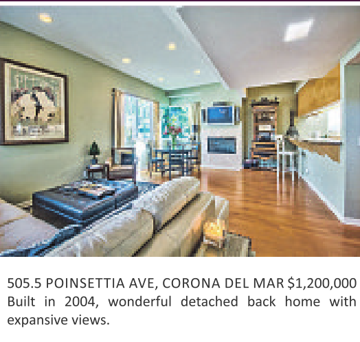 505.5POINSETTIA AVE, CORONA DEL MAR$1,200,000 Built in 2004, wonderful detached back home with expansiveviews.