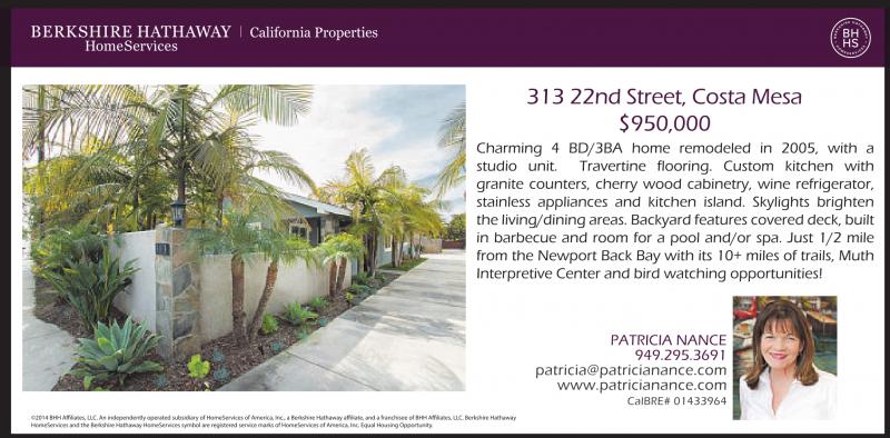 313 22nd Street, Costa Mesa $950,000 Charming 4 BD/3BA home remodeled in 2005, with a studio unit. Travertine flooring. Custom kitchen with granite counters, cherry wood cabinetry, wine refrigerator, stainless appliances and kitchen island. Skylights brighten the living/dining areas. Backyard features covered deck, built in barbecue and room for a pool and/or spa. Just 1/2 mile from the Newport Back Bay with its 10+ miles of trails, Muth Interpretive Center and bird watching opportunities! PATRICIA NANCE 949.295.3691 patricia@patricianance.com www.patricianance.com CalBRE# 01433964 ©2014 BHH Affiliates,LLC.Anindependently operated subsidiaryofHomeServices of America, Inc.,aBerkshireHathawayaffiliate, andafranchisee of BHH Affiliates,LLC.BerkshireHathaway HomeServices and the Berkshire HathawayHomeServices symbol areregistered servicemarks of HomeServices of America, Inc. Equal Housing Opportunity.