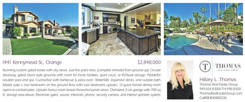 1441 Kennymead St., Orange $2,848,000 Stunning custom gated estate with city views. Just five years new, (complete remodel from ground up). Circular driveway, gated resort style grounds with room for horse facilities, sport court, or RV/boat storage. PebbleTec boulder pool and spa. Cucina/bar with barbecue & pizza oven. Waterfalls, expansive decks, and outside bath. Master suite + two bedrooms on the ground floor with two bedrooms upstairs. 12-guest formal dining room opens to cocktail patio. Upstairs bonus room boasts fireworks/sunset views. Oversized 3-car garage with 700 sq. ft. storage area above. Electronic gates, sound, intercom, phone, security camera, and interior sprinkler system. Hillary L. Thomas Thomas Real Estate Group 949.654.8300/714.998.8300 ThomasRealEstateGroup.com CalBRE#00880226