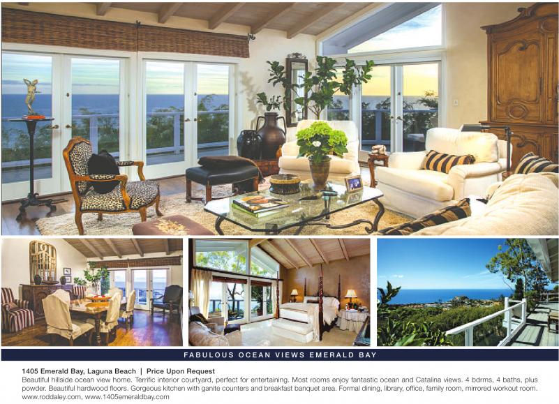 FA B U L O U S O C E A N V I E W S E M E R A L D B AY 1405 Emerald Bay, Laguna Beach | Price Upon Request Beautiful hillside ocean view home. Terrific interior courtyard, perfect for entertaining. Most rooms enjoy fantastic ocean and Catalina views. 4 bdrms, 4 baths, plus powder. Beautiful hardwood floors. Gorgeous kitchen with ganite counters and breakfast banquet area. Formal dining, library, office, family room, mirrored workout room. www.roddaley.com, www.1405emeraldbay.com