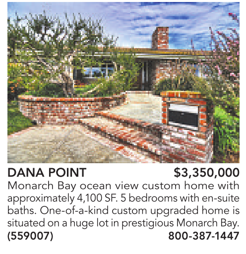DANA POINT $3,350,000 Monarch Bay ocean view custom home with approximately 4,100SF. 5bedroomswithen-suite baths. One-of-a-kind custom upgraded home is situatedonahugelot in prestigiousMonarchBay. (559007) 800-387-1447