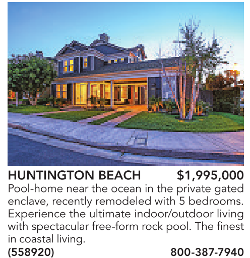 HUNTINGTON BEACH $1,995,000 Pool-home near the ocean in the private gated enclave, recently remodeled with 5 bedrooms. Experience the ultimate indoor/outdoor living with spectacular free-form rock pool. The finest in coastalliving. (558920) 800-387-7940