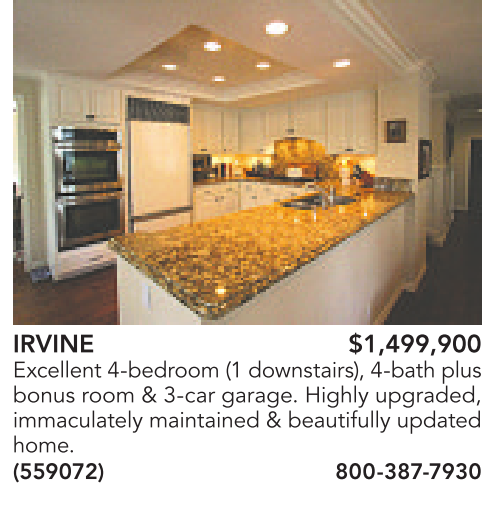 IRVINE $1,499,900 Excellent 4-bedroom (1 downstairs), 4-bath plus bonus room & 3-car garage. Highly upgraded, immaculately maintained & beautifully updated home. (559072) 800-387-7930