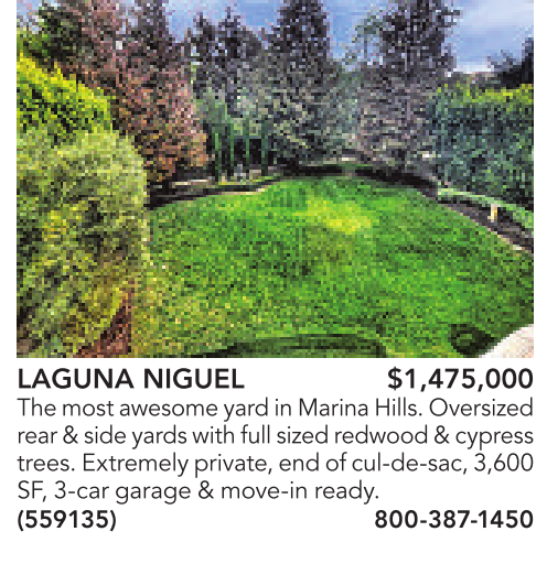 LAGUNA NIGUEL $1,475,000 Themostawesome yard in MarinaHills. Oversized rear &sideyards with full sizedredwood&cypress trees. Extremely private, endofcul-de-sac, 3,600 SF,3-car garage &move-inready. (559135) 800-387-1450