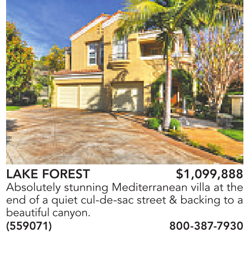 LAKE FOREST $1,099,888 Absolutely stunning Mediterranean villa at the end of a quiet cul-de-sac street & backing to a beautiful canyon. (559071) 800-387-7930