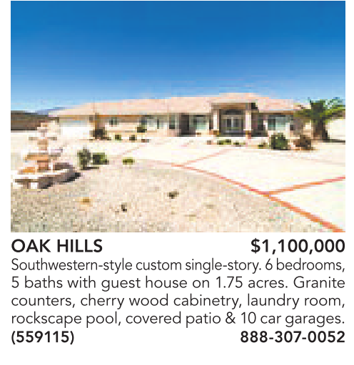 OAK HILLS $1,100,000 Southwestern-style custom single-story. 6bedrooms, 5 baths with guest house on 1.75 acres. Granite counters, cherry wood cabinetry, laundry room, rockscapepool, coveredpatio &10car garages. (559115) 888-307-0052