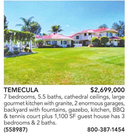 TEMECULA $2,699,000 7 bedrooms, 5.5 baths, cathedral ceilings, large gourmet kitchenwithgranite,2enormousgarages, backyard with fountains, gazebo, kitchen, BBQ & tennis court plus 1,100 SF guest house has 3 bedrooms&2baths. (558987) 800-387-1454