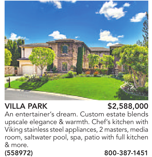 VILLA PARK $2,588,000 An entertainer’s dream. Custom estate blends upscale elegance & warmth. Chef’s kitchen with Viking stainlesssteel appliances, 2masters,media room, saltwater pool, spa, patio with full kitchen &more. (558972) 800-387-1451