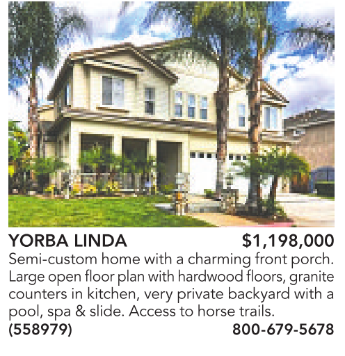 YORBA LINDA $1,198,000 Semi-customhomewithacharmingfront porch. Largeopenfloorplanwithhardwoodfloors,granite counters in kitchen, very private backyard with a pool,spa &slide.Access to horsetrails. (558979) 800-679-5678