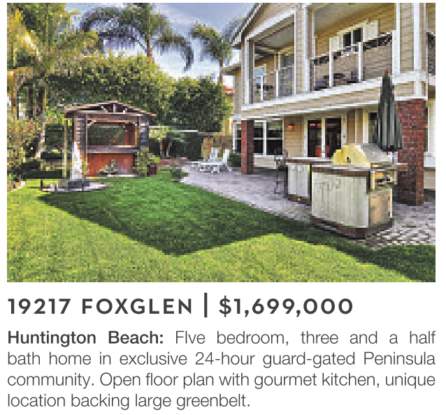 Huntington Beach: FIve bedroom, three and a half bath home in exclusive 24-hour guard-gated Peninsula community. Open floor plan with gourmet kitchen, unique location backing large greenbelt.