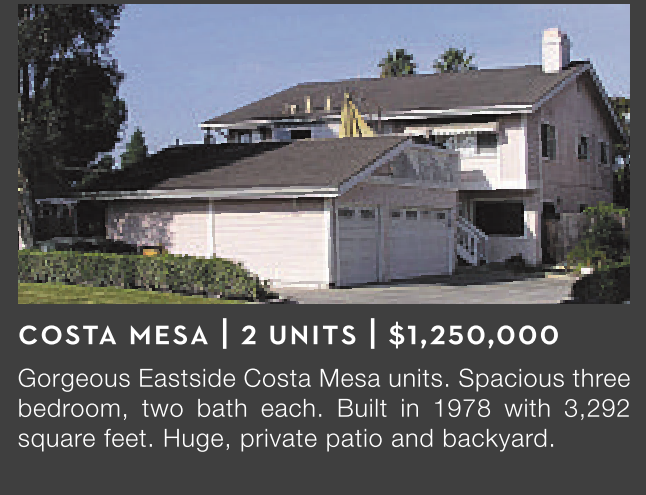 Gorgeous Eastside Costa Mesa units. Spacious three bedroom, two bath each. Built in 1978 with 3,292 square feet. Huge, private patio and backyard.