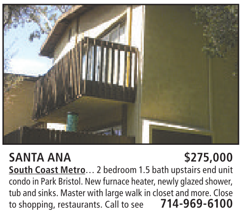 condoinParkBristol.New furnaceheater, newlyglazedshower, tub andsinks.Masterwithlarge walk in closet andmore.Close to shopping, restaurants. Call to see 714-969-6100