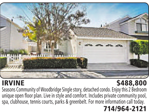 IRVINE $488,800 SeasonsCommunity of Woodbridge Singlestory,detachedcondo. Enjoy this 2Bedroom unique openfloorplan. Live in style andcomfort. Includes private communitypool, spa, clubhouse, tennis courts,parks &greenbelt. Formore informationcalltoday. 714/964-2121