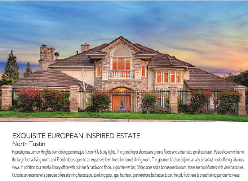 EXQUISITE EUROPEAN INSPIRED ESTATE North Tustin In prestigious Lemon Heights overlooking picturesque Tustin Hills &city lights. The grand foyer showcases granite floors and adramatic spiral staircase. Palatial columns frame the large formal living room, and French doors open to an expansive lawn from the formal dining room. The gourmet kitchen adjoins an airy breakfast nook offering fabulous views. In addition to atasteful library/office with built-ins &hardwood floors, agranite wet bar, 3fireplaces and abonus/media room, there are two Masters with view balconies. Outside, an entertainer’s paradise offers stunning hardscape, sparkling pool, spa, fountain, granite/stone barbecue &bar, fire pit, fruit trees &breathtaking panoramic views.