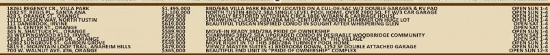 18261 REGENCYCR.,VILLA PARK $1,395,000 8BD/6BAVILLA PARK BEAUTY LOCATEDONACUL-DE-SACW/2 DOUBLEGARAGES &RVPAD OPEN SUN1-4 1082 ST.REGIS PL., SANTAANA $1,100,000 NORTH TUSTIN4BD/2.5BA SINGLELEVEL POOLHOME,OVER2900SQ. FT W/3CAR GARAGE OPENSUN 1-4 428S.ORANGE ST., ORANGE $899,900 LOVINGLYRESTORED VICTORIANCIRCA 1886 W/BARN &CARRIAGE HOUSE OPENSUN 1-4 13111 LASSEN WAY, NORTH TUSTIN $699,900 SPRAWLING CLASSIC3BD/2BA MID-CENTURY MODERNCHARMERONHUGELOT OPEN SUN1-4 111 DANBROOK,IRVINE $619,000 BEAUTIFULTUSCANINSPIREDCONDO INSOUGHT AFTERWHISPERING GLEN OPEN SAT1-4 464S.CENTERST.,ORANGE $599,000 OPEN SAT1-4 345N.SHATTUCKPL.,ORANGE $589,900 MOVE-INREADY 3BD/2BAPRIDE OF OWNERSHIP OPEN SUN1-4 33 WEEPINGWOOD #113,IRVINE $575,000 CHARMING 3BD/2.5BAUPGRADEDCONDO INDESIRABLEWOODBRIDGECOMMUNITY OPEN SAT1-4 5838E.BOTTLEBRUSHDR.,ORANGE $555,000 3BD/2.5BADETACHEDSINGLEFAMILYHOME IN“THEVILLAGE” OPENSAT 1-4 12862SUNGROVEST.,GARDENGROVE $549,900 MOVE RIGHTINTOTHIS3BD/2BA TURNKEYPOOL HOME OPEN SUN1-4 5815 E. MOUNTAIN LOOP TRAIL,ANAHEIMHILLS $479,000 VIEW/2MASTERSUITES +1 BEDROOM DOWN,1752 SF DOUBLEATTACHEDGARAGE OPENSUN 1-4 700W.WALNUTAVE.#36, ORANGE $365,000 BEAUTIFULEND UNIT IN “PRIDE OF OWNERSHIP”COMPLEX OPENSUN 12-3