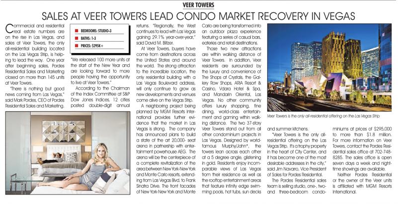 all-residential building located on the Las Vegas Strip, is helping to lead the way. One year after beginning sales, Pordes Residential Sales and Marketing closed on more than 145 units at Veer Towers.